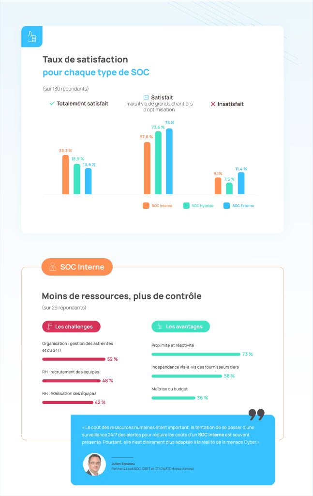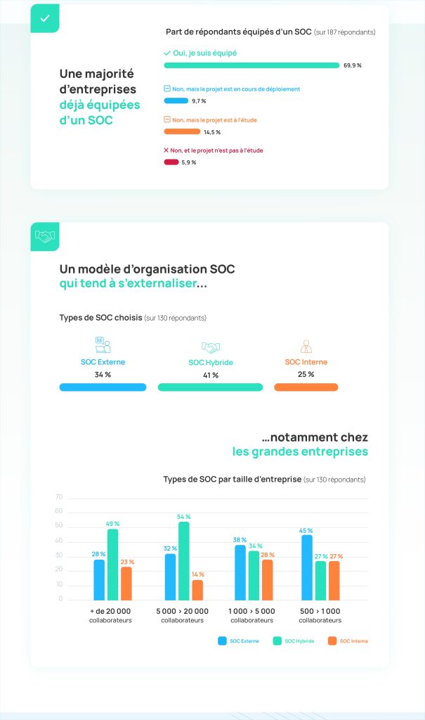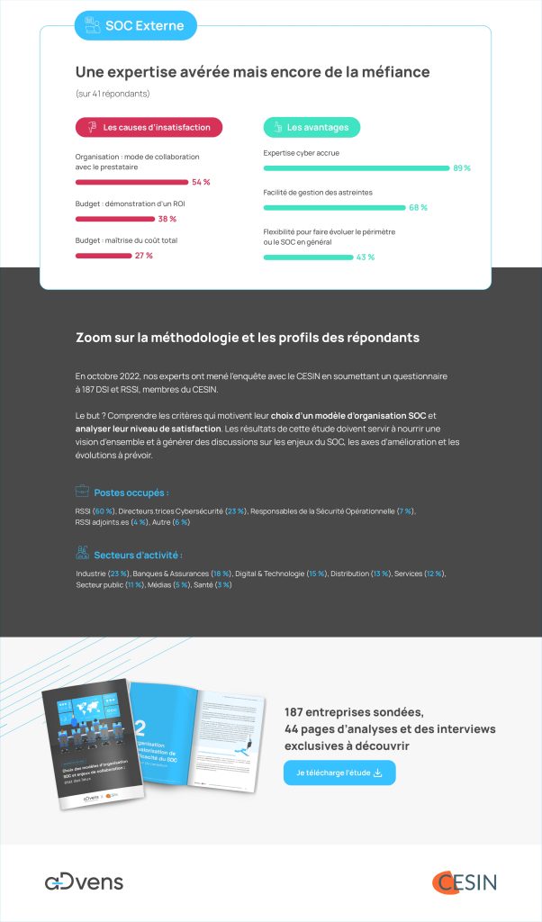Les données représentées dans cette infographie sur les SOC en entreprise sont issues d’un baromètre SOC réalisé entre 2022 et 2023 par les experts d’Advens et le CESIN (Club des Experts de la Sécurité de l’Information et du Numérique), auprès des membres du CESIN.